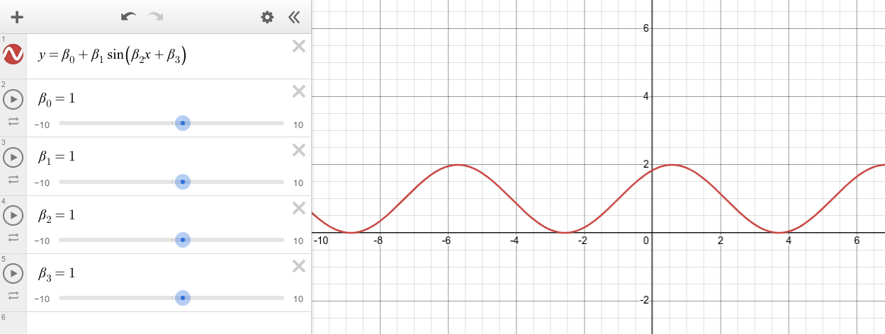 - We are going to adjust, by hand, the parameters of a sinusoidal model (do not do an automated regression): \[ \hat{y} = \hat{\beta}_0 + \hat{\beta}_1 \sin( \hat{\beta}_2 t + \hat{\beta}_3 ) \] Add this model to Desmos as shown (you can type "beta" to create a \(\beta\)).