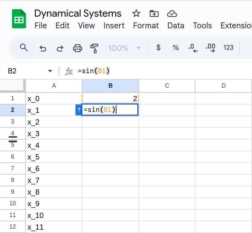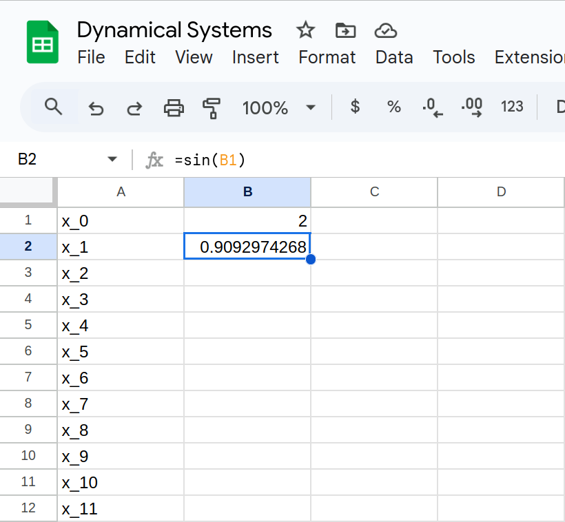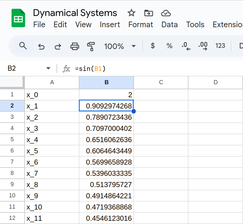 Determine the fate of the orbit of \(x_0=2\) in \[F(x) = \sin(x)\]